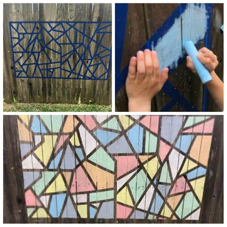 All you need for this activity is colorful chalk and painter’s tape. You can use the tape to make some cool designs on your fence or sidewalk and your kids can color inside the shapes with chalk.