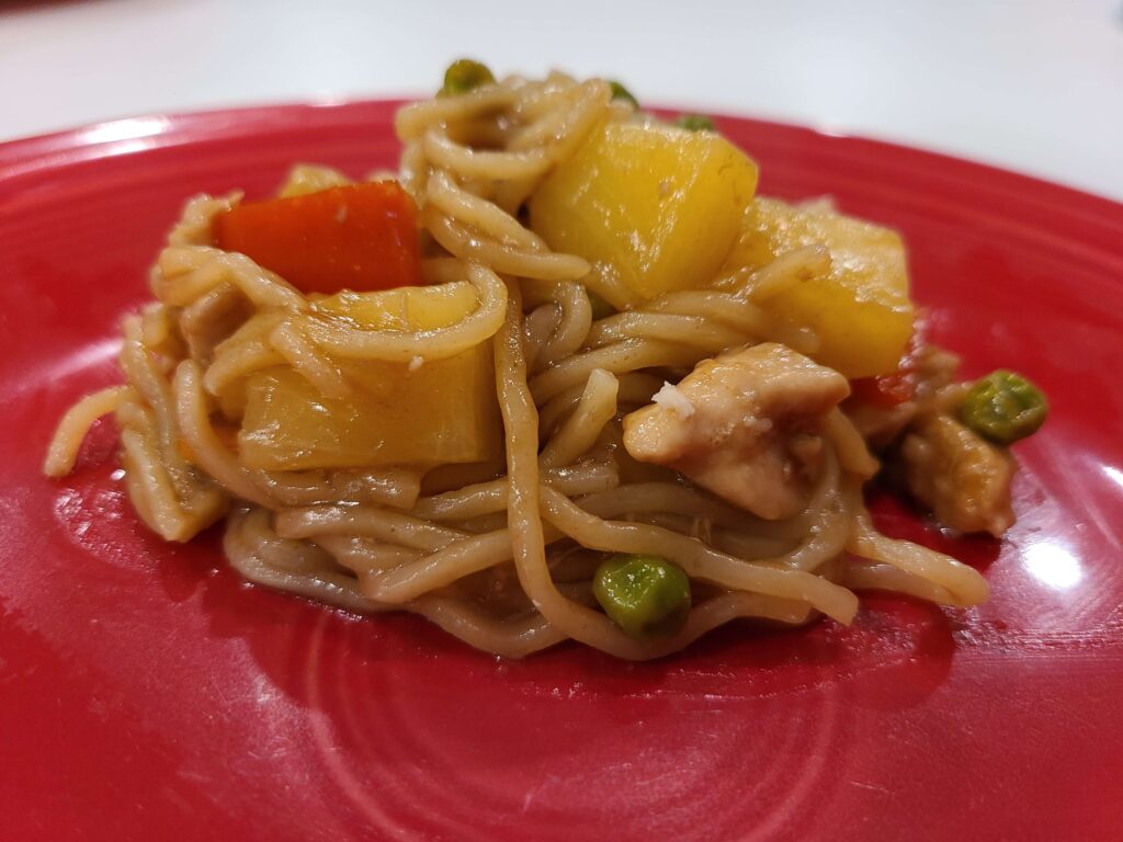 I found some yakisoba noodles at the grocery store that we liked and just started playing around with ingredients to add to the stir fry. You can customize this to your liking, but our favorite ingredients to add to the noodles are chicken, bell peppers, peas (because we are not fans of broccoli) and pineapple chunks.