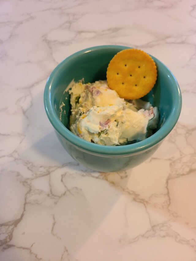 You will not find this cheese ball at fancy dinner parties. This cheese ball is perfect for family get-togethers, football game watching parties, game nights, and more! The best part is it only takes a few minutes to make and everyone will love it. Serve it with your favorite crackers and you are good to go.